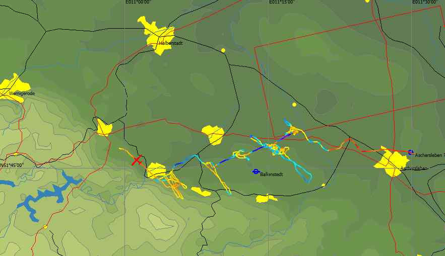 Lage der 5 erflogenen Steiggebiete parallel zur Harzkante, zwischen Aschersleben und Thale. Abstand der Steiggebiete ca. 4 km in Windrichtung (240°). Ausrichtung der Steiggebiete ca. 300°.