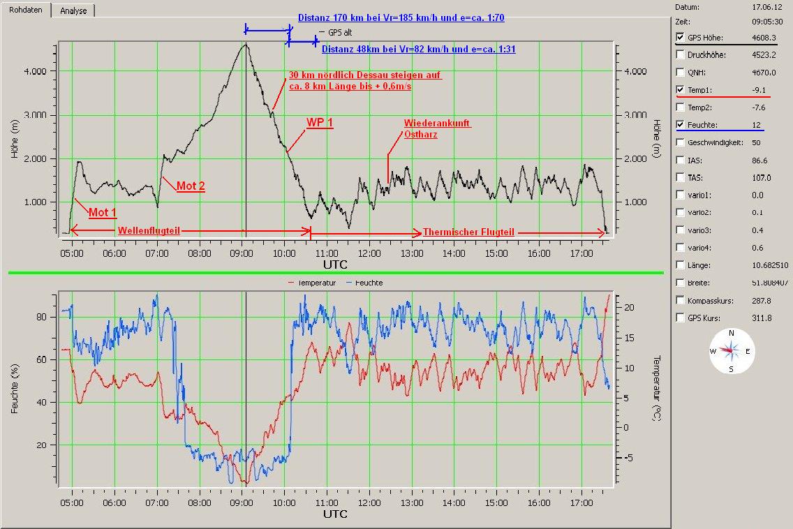 Feuchte- und Temperaturverlauf sowie erflogene Daten aus der Wellenstrecke