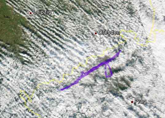 Flugweg überlagert mit Satellitenbild (NOAA Aqua)