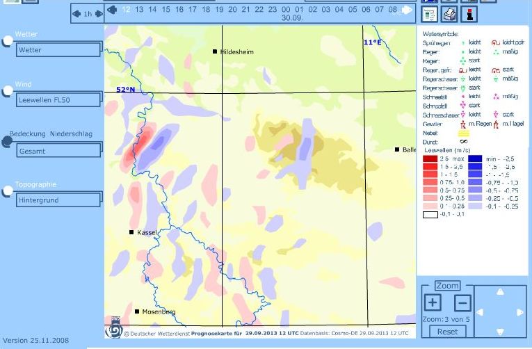Vorhergesagt war eine kräftige südöstliche Strömung unterhalb von 2000m mit bis zu 50 km/h Windgschwindigkeit in Kammhöhe, die darüber schnell abnehmen sollte. Oberhalb von 3000m sollte der Wind über Nord auf West drehen, bei insgesamt geringen Geschwindigkeiten. Die Hoffnung war, dass sich bis 2000m eine Welle am Acker ausbiden könnte.