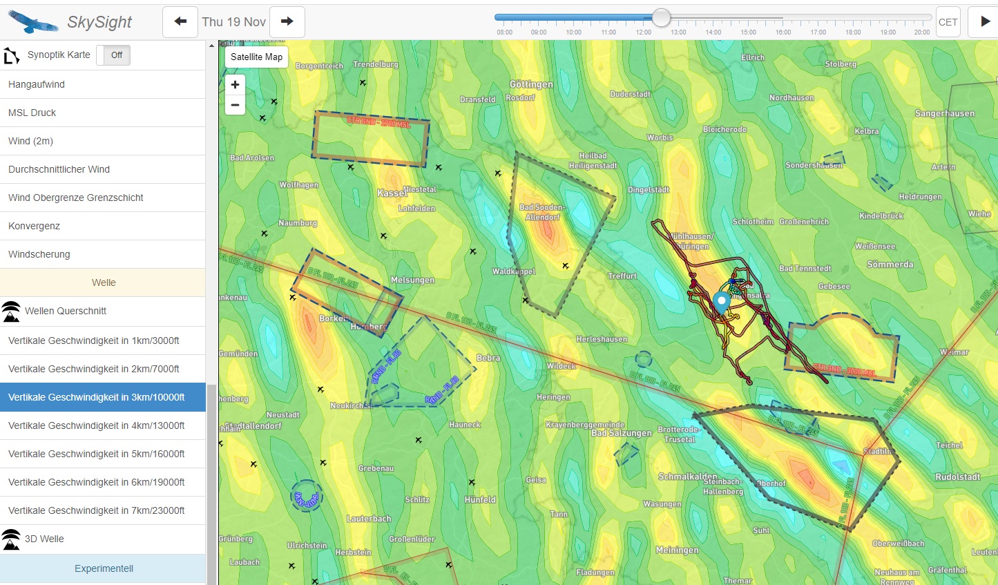 Flugweg und vorhergesagte Steiggebiete von Skysight