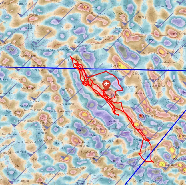 Flugweg und vorhergesagte Steiggebiete von Skysight