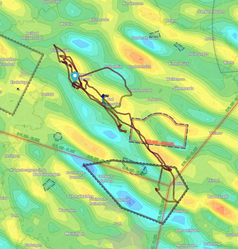 Flugweg und vorhergesagte Steiggebiete von Skysight