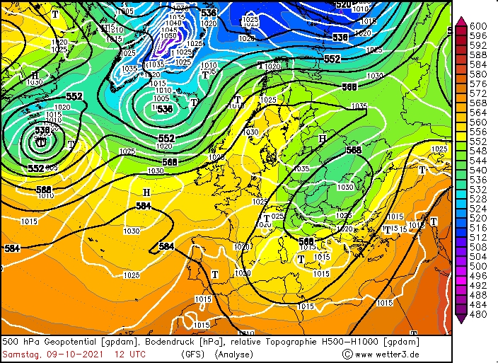 500 hPa Geopotential / Temperatur / Bodendruck, 12 UTC