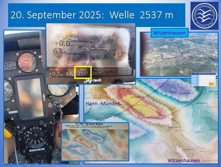 Flugbericht: Am 20.09. nachdem ich die Wellenvorhersage von Rasp Blipmaps ab 13-15:30 gesehen habe, fuhr ich um 10.00 nach Witzenhausen-Burgberg. Baute die Ls4 D-2774 auf und wurde um 11:43 Richtung